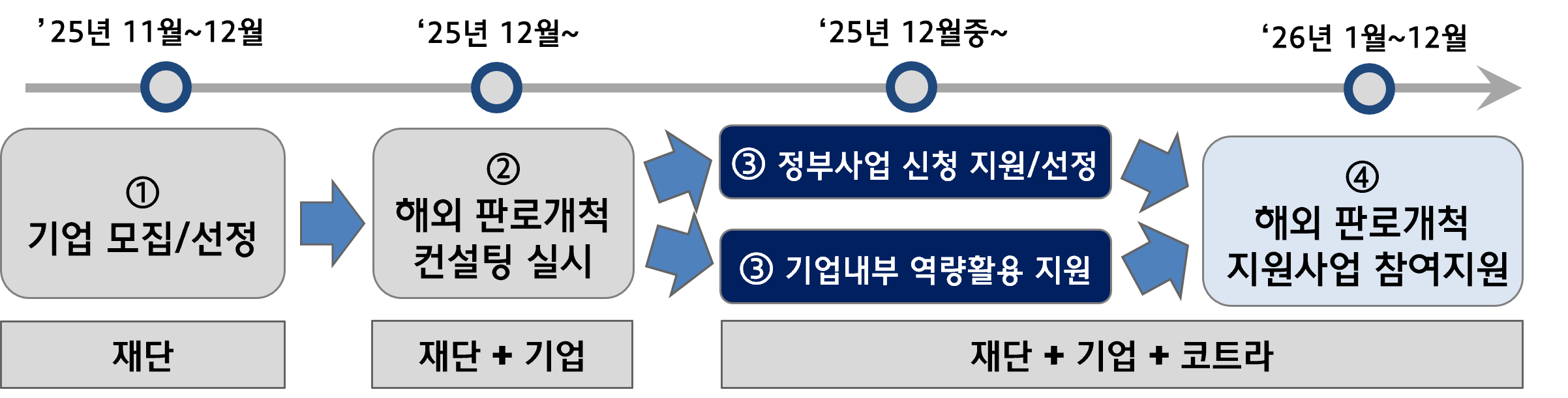 ○ 재단이 유망기업 모집·선정 후 컨설팅을 거쳐, 해외판로개척 지원사업 참여 지원·성과 관리까지 全주기적 모니터링 및 지원