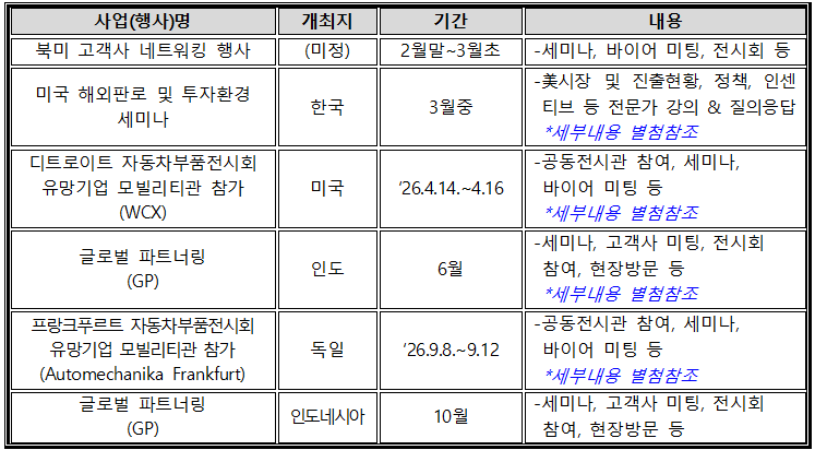 ※ 상기 사업들은 개별 공고 예정이며, 일정, 개최지 등은 현지상황, 부품사 수요 등에 따라 변경될 수 있음